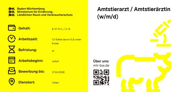 Beim Landratsamt Schwarzwald-Baar-Kreis – Fachbereich Veterinärwesen und Lebensmittelüberwachung – ist zum 01.10.2026 die Stelle einer Amtstierärztin / eines Amtstierarztes (w/m/d) mit einer Tierärztin / einem Tierarzt des höheren Veterinärdienstes unbefristet zu besetzen. Der Dienstort ist Donaueschingen.