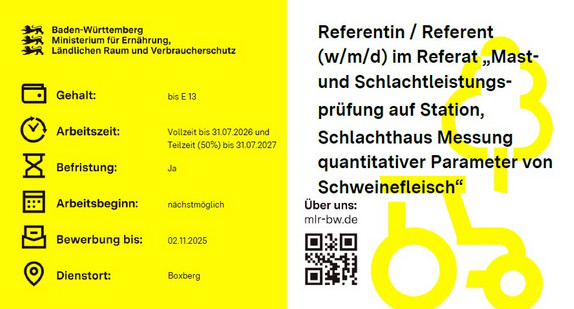 Beim Bildungs- und Wissenszentrum Boxberg - Schweinehaltung, Schweinezucht - (Landesanstalt für Schweinezucht - LSZ) ist in der Abteilung Schweinehaltung zum nächstmöglichen Zeitpunkt eine Stelle als Referentin / Referent (w/m/d) im Referat „Haltungssysteme, Stallbau, Klima- und Umweltwirkungen“ in Vollzeit im Rahmen einer Elternzeitvertretung befristet bis zum 12.04.2026 und danach in Teilzeit mit 50% bis zum 12.04.2027 zu besetzen. Der Dienstort ist Boxberg.