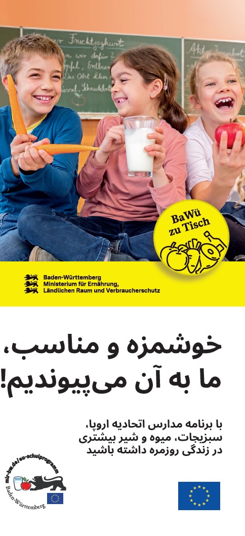 Mit dem EU-Schulprogramm lernen Kinder in Grundschulen und Kitas spielerisch und erlebbar vieles über Obst, Gemüse, Milch und Milchprodukte von regionalen Lieferanten. Der Flyer informiert über das Programm und gibt Eltern Tipps für mehr Gemüse, Obst und Milch im Alltag. Informationen auf Persisch-Farsi