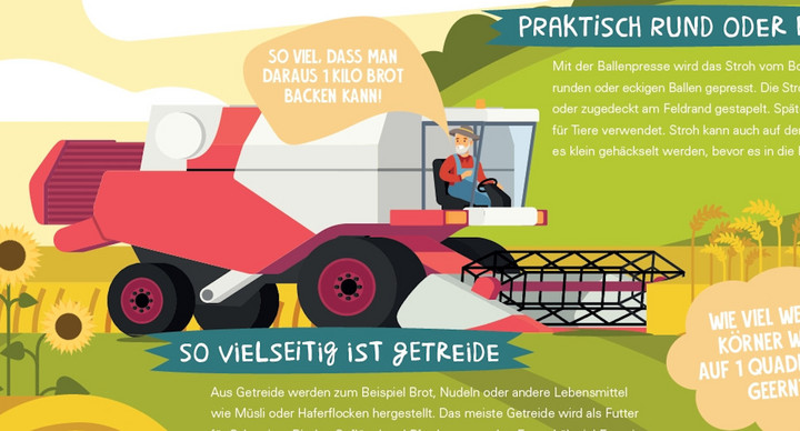 Der Landwirtschaftskalender zeigt die Vielfalt der Landwirtschaft auf und stellt einzelne Aspekte kindgerecht aufgearbeitet und am Jahreslauf orientiert dar. Im Fokus stehen dabei der Anbau und die Ernte von Nutzpflanzen, deren Vermarktung und die Tierhaltung. Die digitalen Begleithefte bieten weitere Hintergrund- und Zusatzinformationen zu den monatlich behandelten Themen, enthalten zahlreiche Arbeitsblätter und liefern Ideen für Aktivitäten im Unterricht. Im August steht die Getreideernte im Mittelpunkt. Die Kinder entdecken, welche Getreidearten bei uns überwiegend angebaut werden. Sie lernen die Getreideernte von früher und heute kennen, wobei der Mähdrescher als wichtige Erntemaschine genauer betrachtet wird. Informationen zum Aufbau und zu Inhaltsstoffen des Getreidekorns runden den Monat ab.