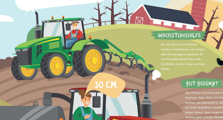 Der Landwirtschaftskalender zeigt die Vielfalt der Landwirtschaft auf und stellt einzelne Aspekte kindgerecht aufgearbeitet und am Jahreslauf orientiert dar. Im Fokus stehen dabei der Anbau und die Ernte von Nutzpflanzen, deren Vermarktung und die Tierhaltung. Die digitalen Begleithefte bieten weitere Hintergrund- und Zusatzinformationen zu den monatlich behandelten Themen, enthalten zahlreiche Arbeitsblätter und liefern Ideen für Aktivitäten im Unterricht. Im März erhalten die Kinder Einblick in das Thema Frühjahrsarbeiten und Boden. Die Getreideaussaat veranschaulicht, welche Arbeiten die Landwirte im Frühjahr durchführen. Die Kinder lernen Gülle und Mist als wichtigen Dünger und seine Bedeutung im Nährstoffkreislauf kennen. Die Bedeutung und Aufgabe des Bodenlebens wird am Beispiel der Regenwürmer erklärt.
