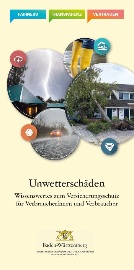 Wissenswertes zum Versicherungsschutz für Verbraucherinnen und Verbraucher Schwere Unwetter aufgrund des weltweiten Klimawandels betreffen zunehmend auch Baden-Württemberg – und haben für viele Menschen im Land schmerzliche Folgen, persönlicher und finanzieller Art. Wir möchten Ihnen daher mit diesem Flyer einen komprimierten Überblick über die wichtigsten Versicherungen geben und Sie auf Besonderheiten hinweisen.