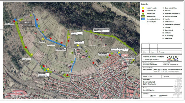 Der Calwer Biodiversitätspfad beginnt am Parkplatz des Friedhofes im Stadtteil Calw-Heumaden. Am Übergang der Schwarzwaldrandplatten zur Gäulandschaft bietet der Weg einen schönen Blick nach Calw ins Tal und zu den Höhen jenseits des Nagoldtales. Dabei bewegt man sich überwiegend im Bereich von Wiesen, Weiden, Streuobstwiesen und entlang des Waldes in offenen und besonnten Strukturen. Nur ein kleiner Teil des Weges verläuft innerhalb des Waldes / Waldrandes und ist beschattet. Entlang des Biodiversitätspfades werden verschiedene Themen mit Informationstafeln und auch interaktiven Elemente angesprochen. Das Hauptanliegen ist es, das Thema Biodiversität zu erklären und dafür zu sensibilisieren. Der Weg, der immer wieder mit speziellen Wegweisern ausgezeichnet ist, beginnt am Startpunkt mit einer Drehscheibe zum Thema – was ist Biodiversität? Daneben befindet sich ein Plan und die Aufforderung mit offenen Augen und Ohren den Pfad zu begehen und den ersten Blühstreifen zu bewundern. Dann werden die Themen – Artenvielfalt der Wiesen, wann ist eine Wiese artenreich, erläutert. Ein Vergleich von extensiver und intensiver Bewirtschaftung wird gezogen. Der Sinn von Blühstreifen und die Tierwelt artenreicher Wiesen wird in einer Station mit Drehtafeln thematisiert. Steinhaufen, Baumhöhlen, Nisthilfen, Streuobstwiesen und auch die Hecke als Lebensraum werden beleuchtet. Bei einem Memory kann man mit und gegeneinander spielerisch die Tier– und Pflanzenwelt kennen lernen. Am Waldrand gibt es ein kleines Fenster, durch das ausgewählte Tiere des Waldes als Silhouetten gefunden werden müssen. Am 7-Bäume-Weg werden die am meisten vertretenen Waldbäume vorgestellt. Unterwegs sind immer wieder informative Drehscheiben oder Tafeln zu Bienen und Wildbienen, Altgrasstreifen und Insekten angebracht. Kleine Fokussierstationen sollen zum genauen Betrachten einladen. Am Ende rundet eine interaktive Station zum Thema Fledermäuse, die in dieser offenen Landschaft vorkommen, den Pfad inhaltlich ab. Zwischen den Stationen befinden sich immer wieder kleine Quiz – und Ratetafeln. Wenn man möchte kann man den Pfad auch mit einer Actionboundrallye über das Smartphone begehen und erleben. Die Lösungen dazu sind auf dem Pfad zu finden. Am Ende des Spazierganges lockt die Innenstadt auf einen kleinen Besuch.